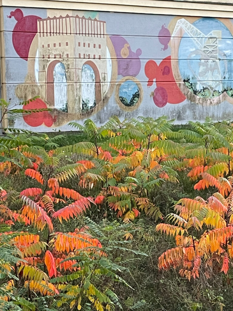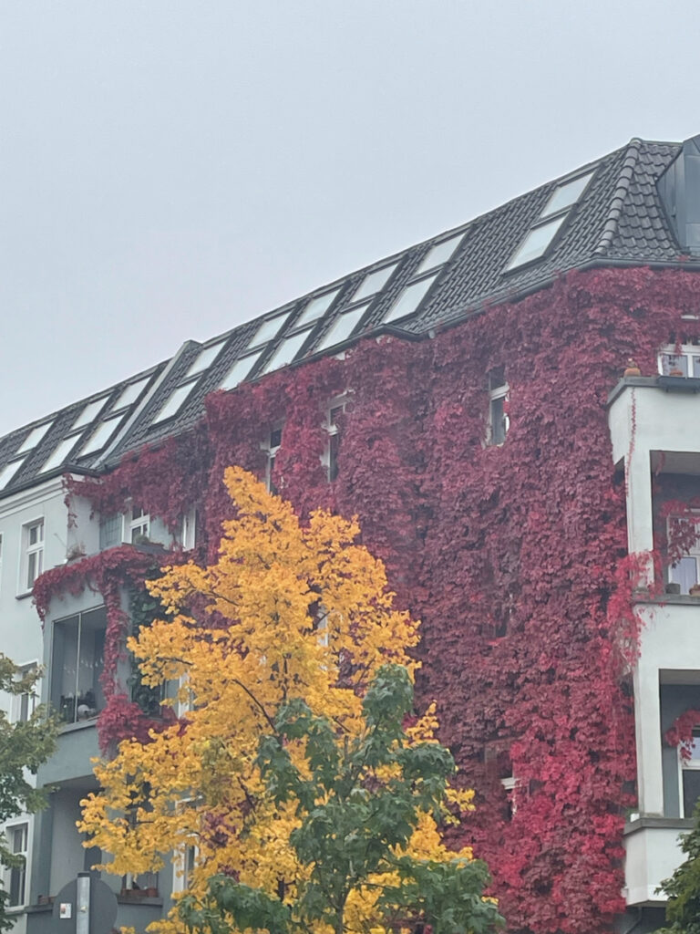 Und dazwischen: Farbe gegen Grau. Eine Hauswand, überwuchert von wildem Wein, und davor ein Baum, der aussieht, als wäre er direkt aus einer Postkarte gefallen. Ich bleibe stehen, mache ein Foto.