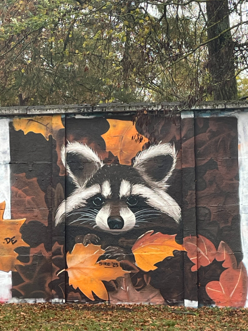 Ein paar Straßen weiter entdecke ich ein Waschbär-Graffiti. Er lugt zwischen den Blättern hervor, als würde er sagen: „Na, du auch schon im Herbstmodus?“